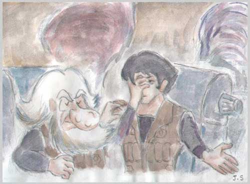 「博士、 ゴドーと話してください」 薄暗く点滅している廊下のライトに照らされたオルガの顔は、 表情があるはずがないのに、 心配そうに見えた。 ゴドーが元気をなくしていることにサルタも気づいていたが、 ロボットにまで言われると大したことだ。 難破軍艦を見つけた日からずっと落ち込んでいる。 確かに、 宇宙を漂う壊れた船は不気味な眺めだった。 しかしサルタから見れば破損はさほど恐ろしくもなかった。 ほとんどの武器がまだ使える状態だったので、 二基のレーザー砲を外して自分たちの船に積んでおいた。 死んだパイロットのことは、 自分の教官だったとゴドーが言っていた。 教師は若者にとって誰よりも大切な存在だったりする。 だが、 オルガが言うにはあのボルカン教官が残酷で性悪な人間でゴドーと特に仲が悪かった。 あんな悪漢が死んだからといって、 ロボットまで心配させて哀しむのか。 ゴドーの気持ちがよく分からないまま、 サルタはほっとくことにしていた。 そして今はオルガが頼んできたのだ。 「ゴドーと話してください。 ゴドーは悩んでいます。 オルガに慰めてあげることができません。 オルガがそんなことを考えると電子頭脳が燃えてしまうとゴドーが言っています」 サルタがゴドーのいるコックピットへ向かうと、 背後でうるさい金切り声がした。 「やれやれ、 何を悩んでいるんだか知らねえけど、 世話の焼ける坊やだぜ」 クラックだ。 今の話を聞いていたのか、 その悪ガキ。 サルタは聞こえない振りをして廊下を歩いた。 しかしクラックが一人ではなかったらしい。 ぬいぐるみロボットのピンチョがたしなめる。 「そんなこと言うなよクラック」 「へっ、 俺の考えるところではせいぜい地球に残してきたとかいう女のことさ、 くだらねえ」 ピンチョは思いをめぐらすように「レナのことだったら、 俺はよく覚えているよ、 俺は彼女のペット・ロボットだったんだ。 ゴドーとレナは愛し合っていたはずだった。 身分違いだったけど、 それははっきりしていたよ。 でも、 レナは裏切った。 俺にとっては今のレナは何の意味も持たないよ。 ゴドーも彼女のことは早く忘れた方がいい…」 おどろくほどの会話能力。 さすが、 おしゃべりするために作られたロボットだ。 クラックの言うとおりでなければいい、 とサルタが思った。 女のことはさっぱり分らない。 若い頃に振られた経験はあるが、 本格的に仕事を始めてから研究の内容以外考える暇のない人生だった。 恋愛相談の相手はできない。 「へー、 するとおまえはあくまであの坊やの肩を持つんだな、 俺は違うね、 どうもあいつは好かないんだ」 とクラックが言い張ると、 ピンチョは「いい加減にしろよ、 クラック。 どうしてそんなにひねくれているんだ」 「ひねくれているとはなんだ! 」 「本当のことだろ?」 「やる気か! 」 サルタが振り向くと、 すでに二人の取っ組み合いのけんかが始まっていた。 最近ゴドーがクラックの相手をしなくなったので、 ロボットをいじめることが多くなった。 「おい、 やめろ! 」 クラックがしぶしぶとピンチョを放して、 床にころがっていた何かの機器のふたを「ちくしょう! 」 とけっとばした。 「いてっ! 」 ふたは廊下の壁という壁をぶつかって、 最後にクラックの後頭部を直撃したのだ。
